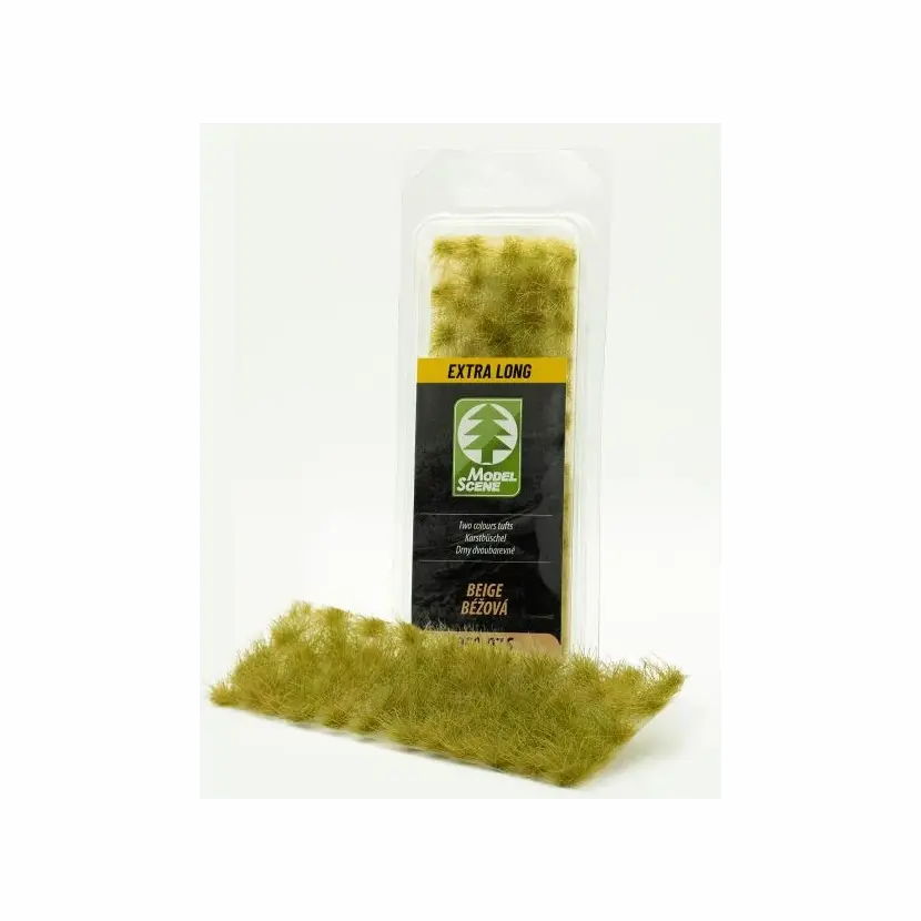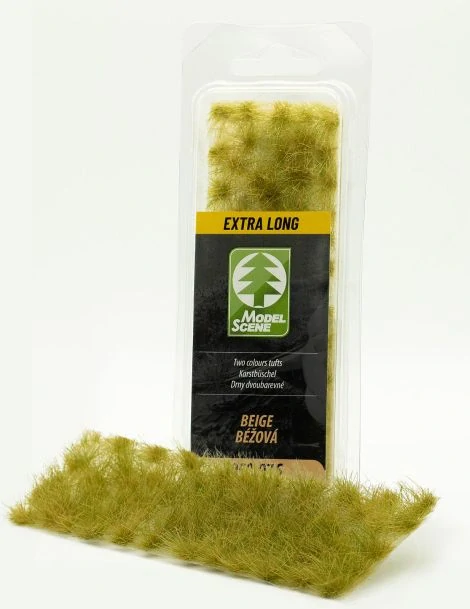 Drny EXTRA DLOUHÉ - béžové. Dvoubarevné drny s kombinací středně dlouhých a extra dlouhých vláken (6,5 a 12 mm) umožňují snadno vytvořit živý, objemný a přirozený vzhled terénu. Jsou ideální zejména pro větší měřítka plastikového modelářství, ale skvěle se uplatní i na kolejištích ve velikosti H0 – například při znázornění křovin, vyšších trsů trav nebo bujné vegetace podél cest, tratí nebo v přírodních zákoutích. Každé balení obsahuje minimálně 100 jednotlivých trsů. Produkty jsou ručně vyráběné, UV stabilní a připravené k okamžitému použití: stačí je pinzetou odloupnout z podkladu a vlepovat přímo na požadované místo.