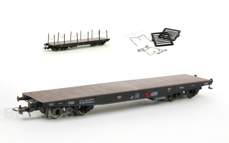 Plošinový vůz Smmps ČD s klanicemi. Vůz vhodný pro přepravu libovolných nákladů od dřeva po automobily. Inventární číslo vozu 31 54 462 4446-5.