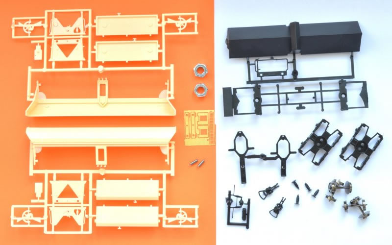 Stavebnice vozu Falls/Wap kompletní sada dílů na vůz, ex-VDV, obsahuje dvojkolí a podvozky fy Bramos.