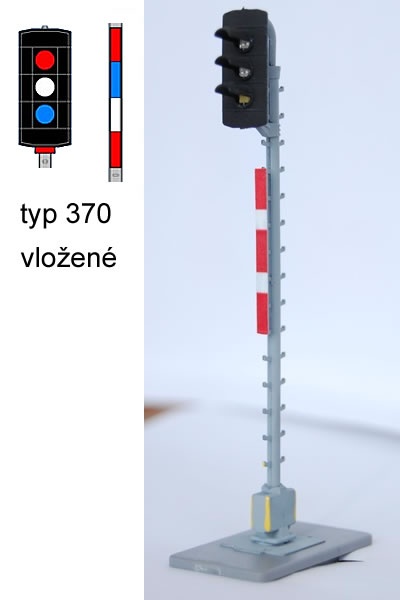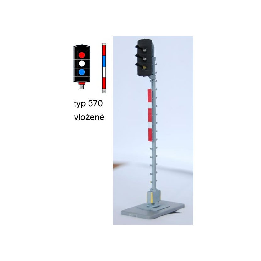 Světelné návěstidlo AŽD - vložené návěstidlo. Pořadí světel zhora: č/b/m. 6-pinový konektor s připojením signálů přes ochranné odpory přímo na LED. Návěst je možné napájet 12VDC nebo 16VAC napětím. Návěstidla jsou zhotoveny z přesných výlisků, plně osazeny LED. Jsou usazeny v obdélníkové šachtě, která obsahuje elektroniku nebo konektor. Šachta se zasouvá do přesné objímky. Součástí balení je návěstidlo v šachtě, objímka pro uchycení do kolejiště, konektor + piny pro připojení.