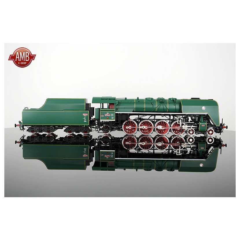 Parní lokomotiva 475.1142 ČSD. III. Ep. 1955. Výrobce: Škoda, výr. č. 2665/1951. Kylchap. Nátěr: zelený se žlutými linkami, červená kola. Plzeňská dráha. Depo: Plzeň. Lokomotiva bude mít na dýmničních dveřích hvězdu stejné velikosti jako 475.185.
