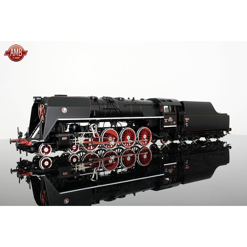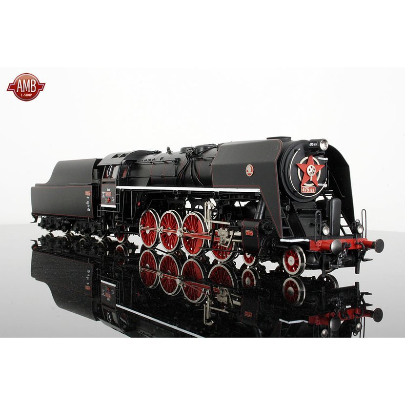 Parní lokomotiva 475.163 ČSD. III. Ep. 1965. Výrobce: Škoda, výr. č. 1885/1948. Kylchap. Usměrňovače kouře francouzského typu.