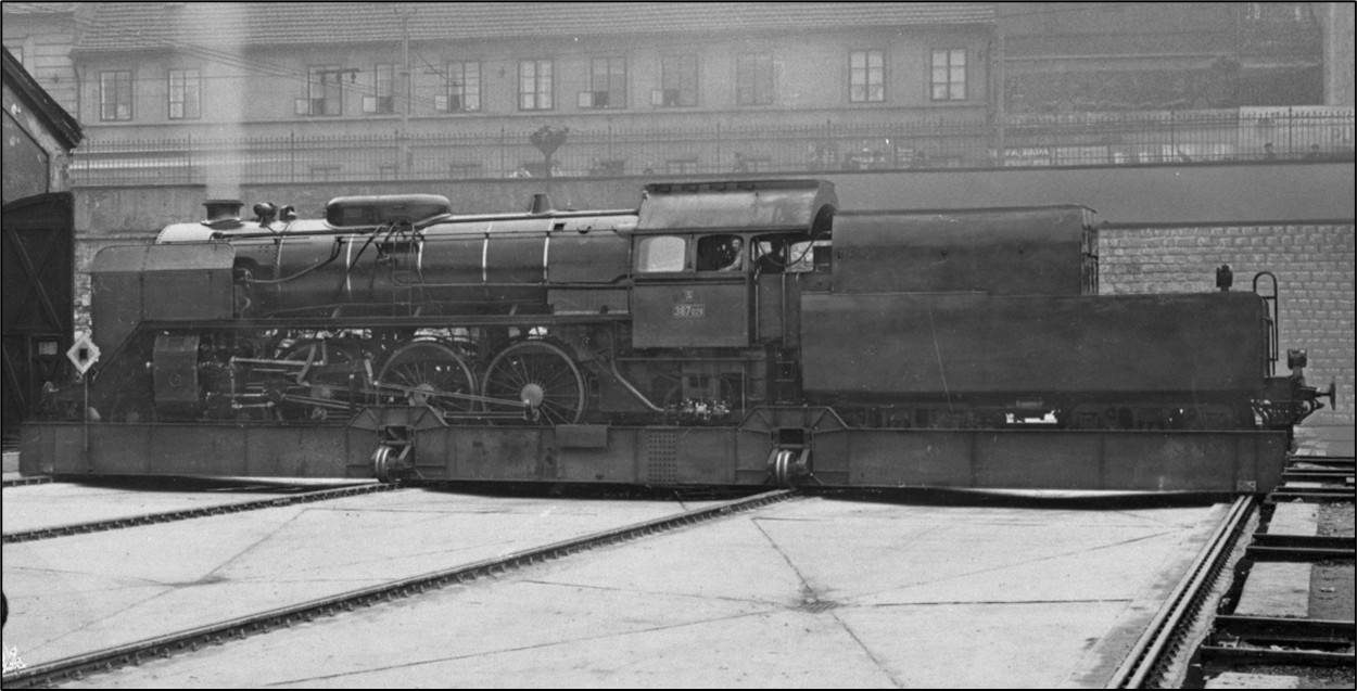 Parní lokomotiva 387.028 s tendrem 930.102 ČSD. Výrobce: Škoda, výr. č. 777/1934. Stav z výroby. Jednoduchý komín.