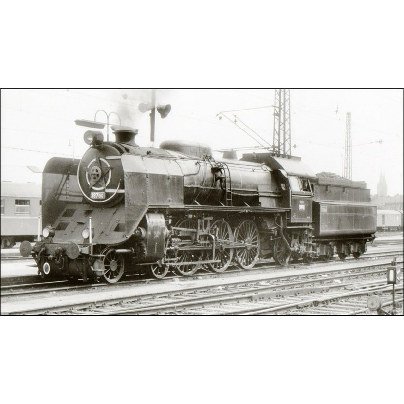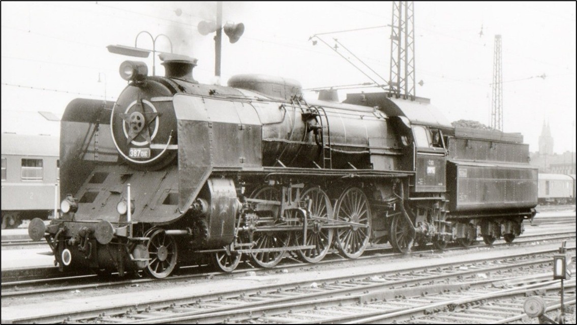 Parní lokomotiva 387.016 s tendrem 923.001 ČSD. Výrobce: Škoda, výr. č. 759/1932. Jednoduchý komín