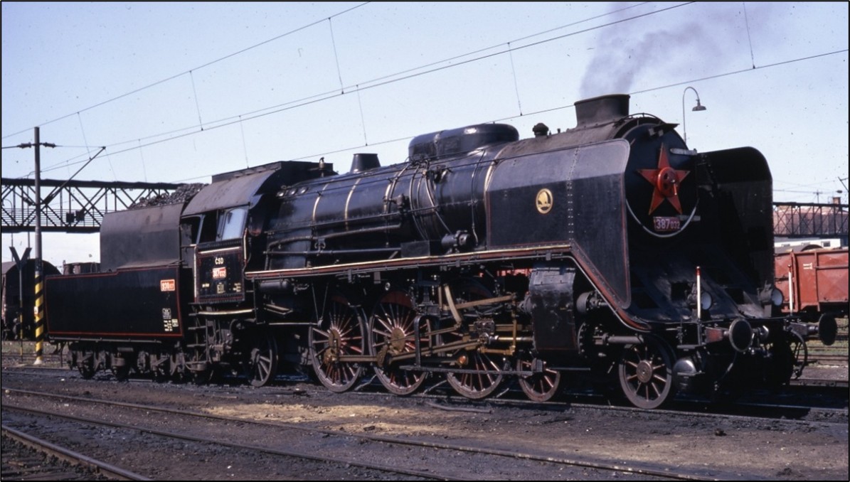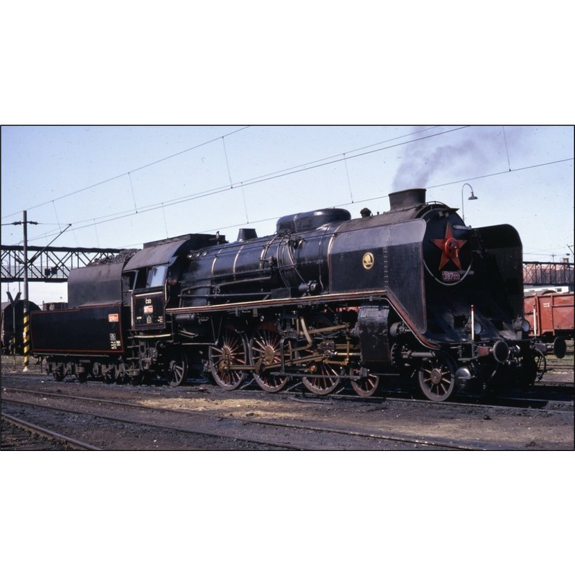 Parní lokomotiva 387.032 s tendrem 930.107 ČSD. Výrobce: Škoda, výr. č. 812/1936. Kylchap.