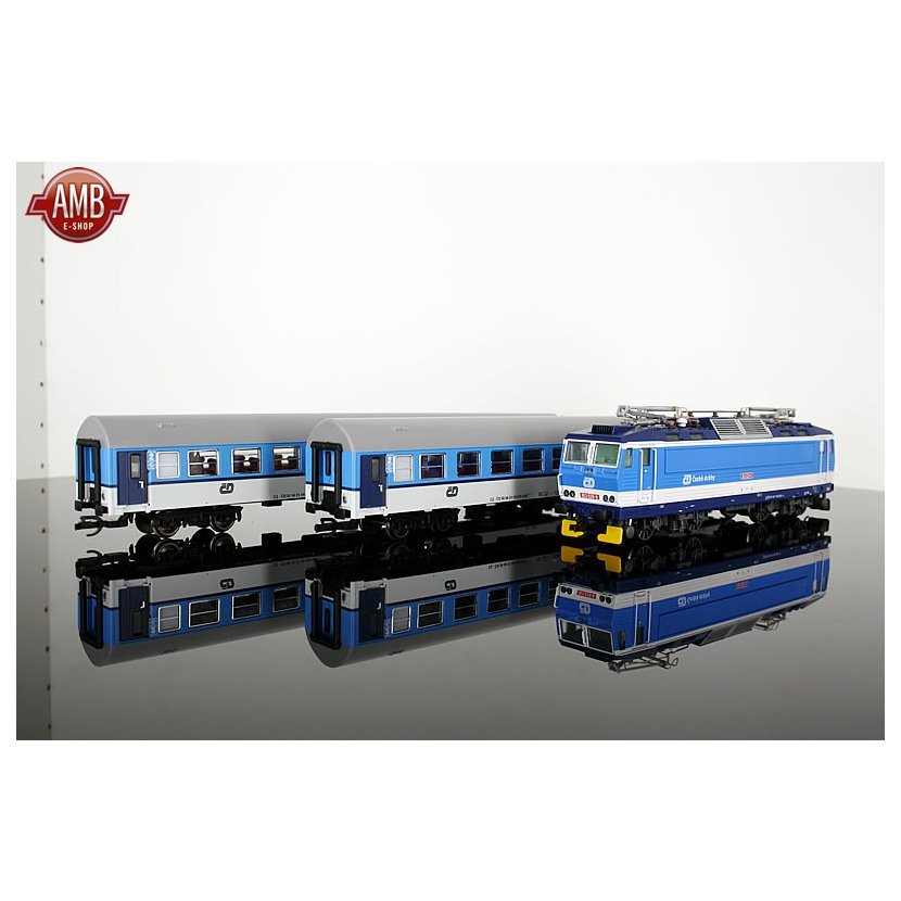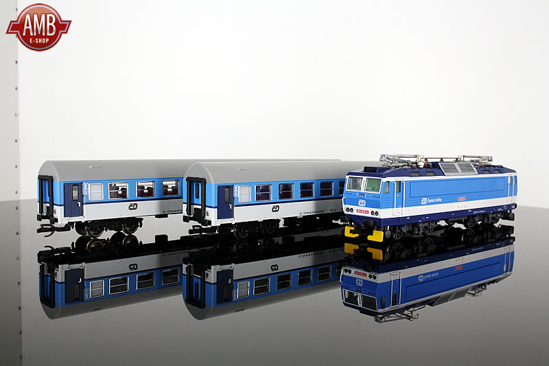 Set loko 163-026 a 2x vozu Bt. Vozy vybaveny DCC osvětlením, přiložen konfigurátor USB. Elektrická lokomotiva řady 163 (E499.3) byla vyráběná v několika seriích ve Škoda Plzeň 1984-92 v počtu 120ks+60ks upravené řady 162. Vznikla vypuštěním střídavé části z lokomotivy 363. Lokomotiva o výkonu 4 000 kW a vybavená tyristorovou regulací je určena pro vozbu vlaků na tratích ss napětí 3000 V, jako náhrada za řady 140 a 141. Po rozdělení v roce 1992 se stroje u ČD univerzálně používají pro nákladní i osobní vlaky, u ŽSR slouží jen v osobní přepravě. Později přistoupily ČD k rekonstrukci řad 162 na vyšší rychlosti či ČD -cargo k modifikaci na dvousystemové řady 363.5.