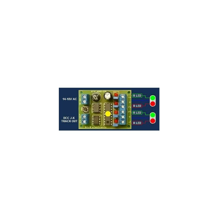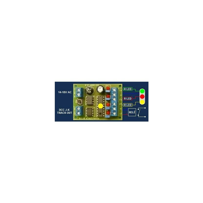 Relé (12VDC) sepne, když svítí na návěstidle červená. K dekodéru je možno připojit jedno nebo dvě dvojsvětelná návěstidla, nebo jedno třísvětelné návěstidlo a ovládací relé.